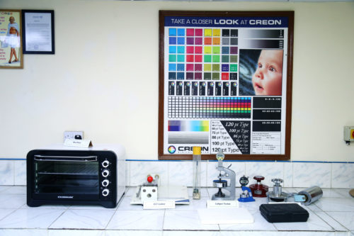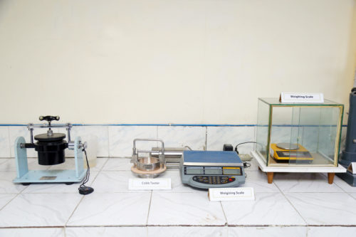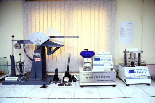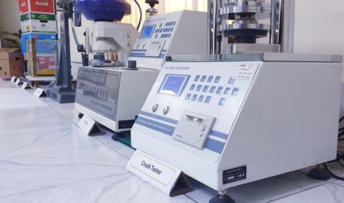 The lab is equipped with sophisticated machines for testing various product attributes like GSM, bursting, piercing, and compression strength.